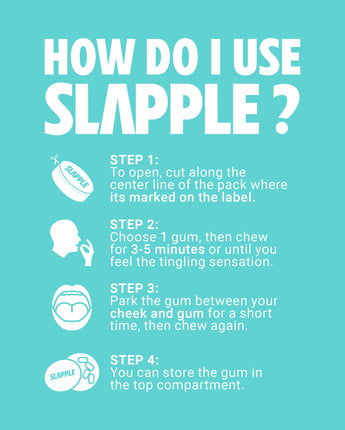 Chew until you feel a tingling sensation (the 'Slap'). Then, 'park' the gum between your cheek and gums. When the tingling fades, chew briefly and park it again. Repeat for 30 minutes for max relief.